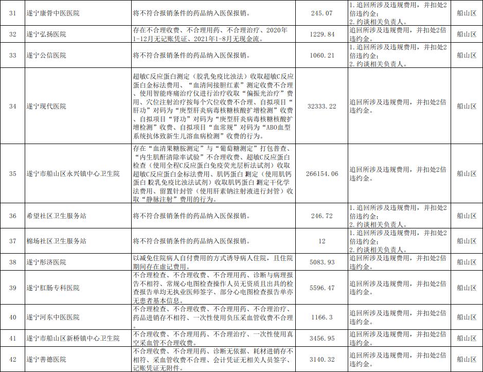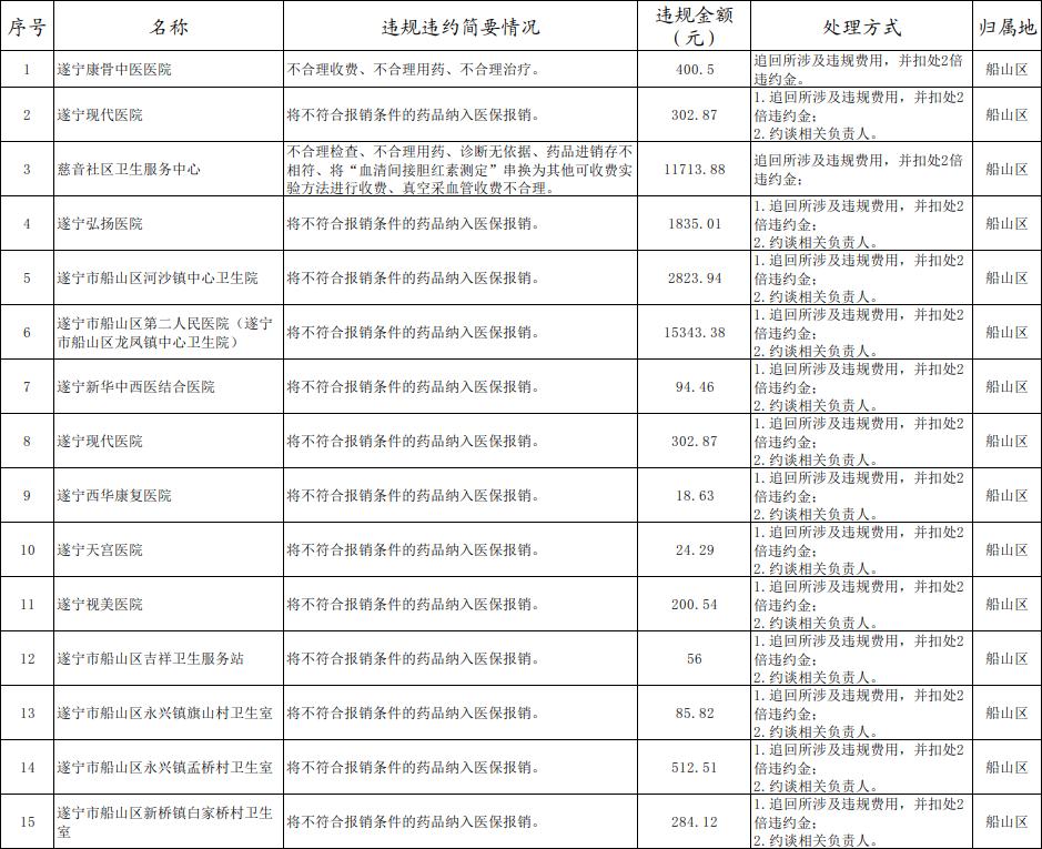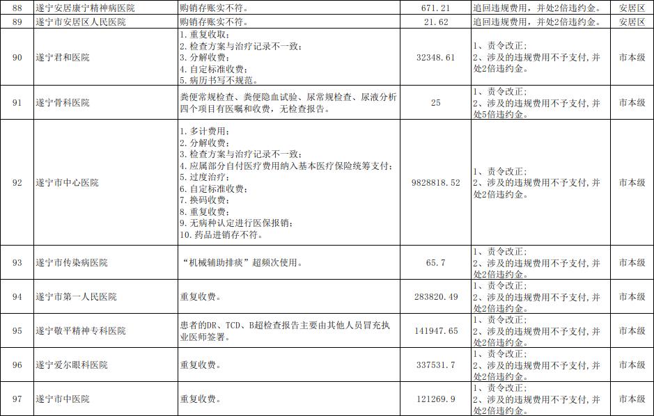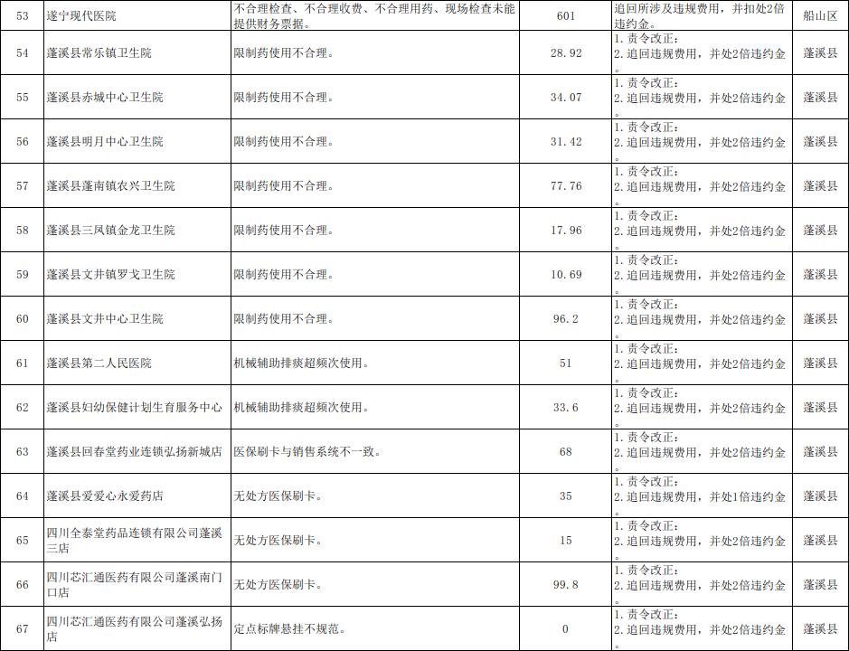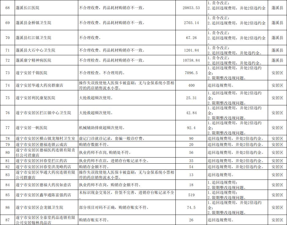 近年来,按照国家医保局、省医保局部署,遂宁市各级医保部门对多家违规违约的医保定点医药机构进行了严肃处理。按照《医疗保障基金使用监督管理条例》关于“加大对医疗保障基金使用违法案件的曝光力度,接受社会监督”的规定和国家医保局、省医保局的要求,现将97个医保基金监管案例曝光于后。