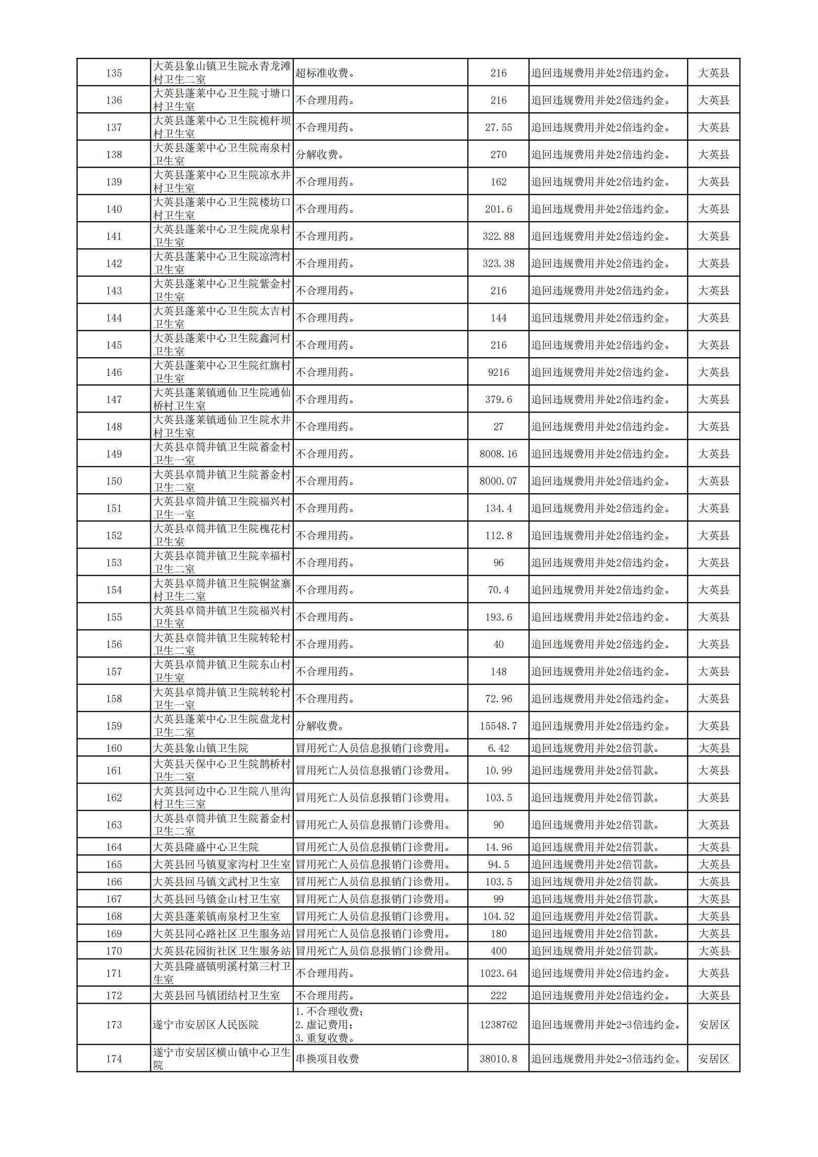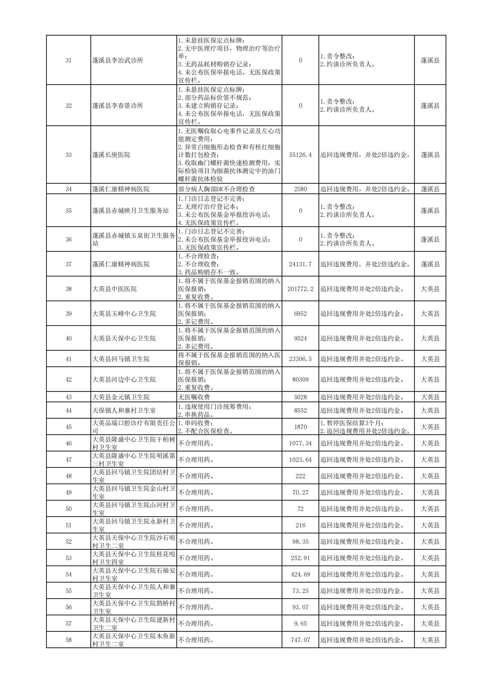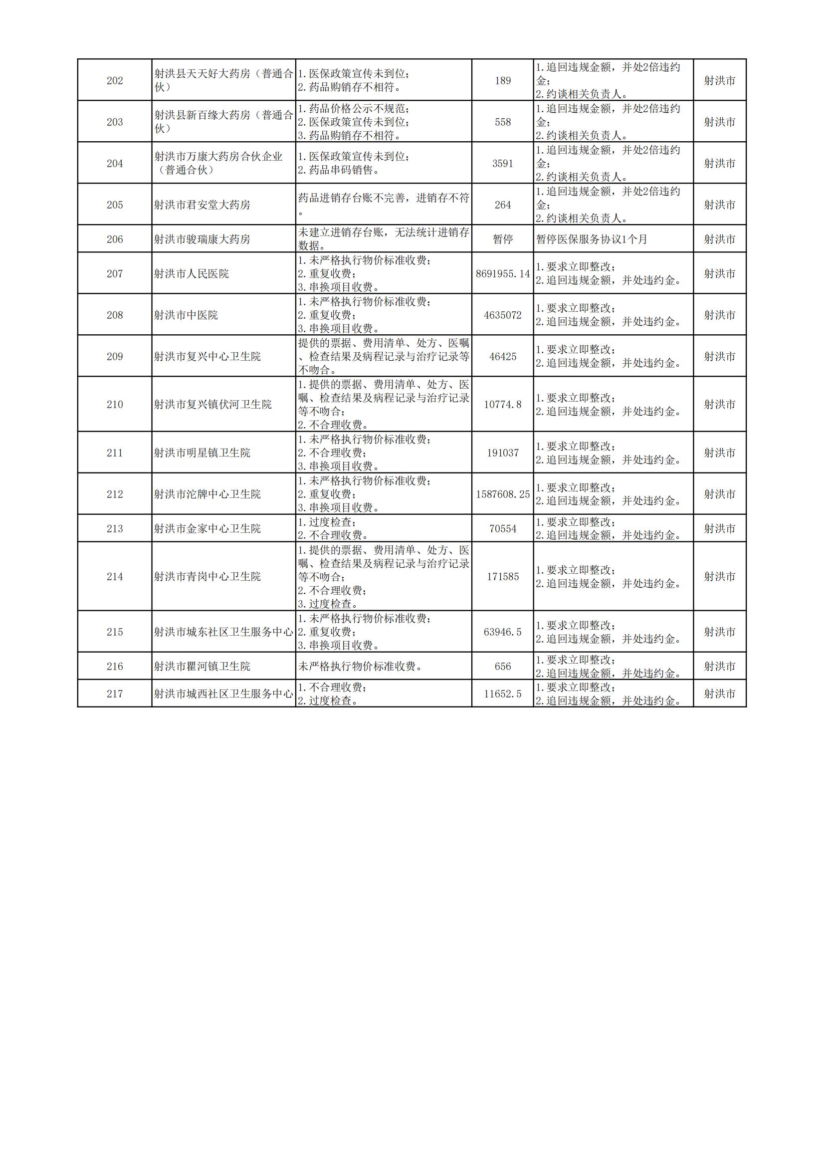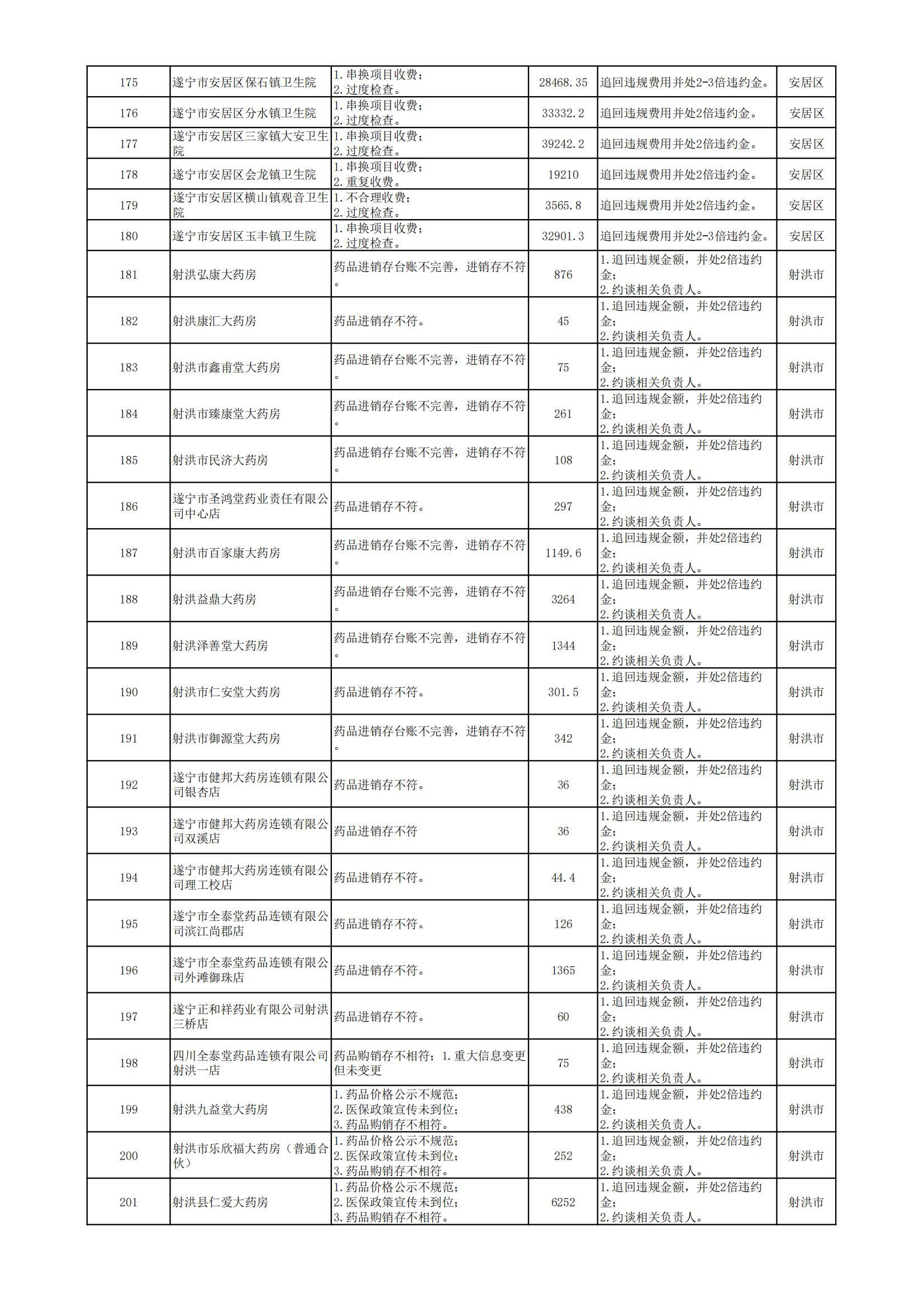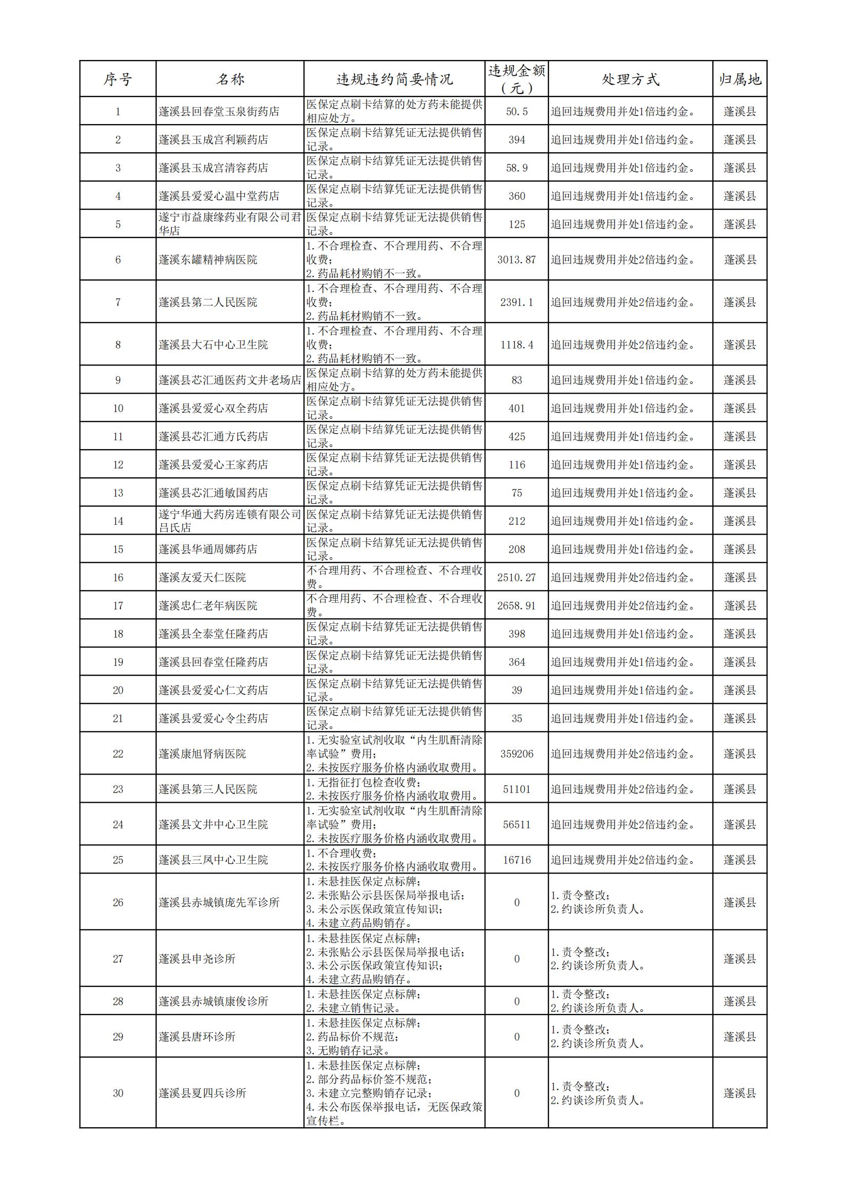 近年来,按照国家医保局、省医保局部署,遂宁市各级医保部门对多家违规违约的医保定点医药机构进行了严肃处理。按照《医疗保障基金使用监督管理条例》关于“加大对医疗保障基金使用违法案件的曝光力度,接受社会监督”的规定和国家医保局、省医保局的要求,现将217个医保基金监管案例曝光于后。