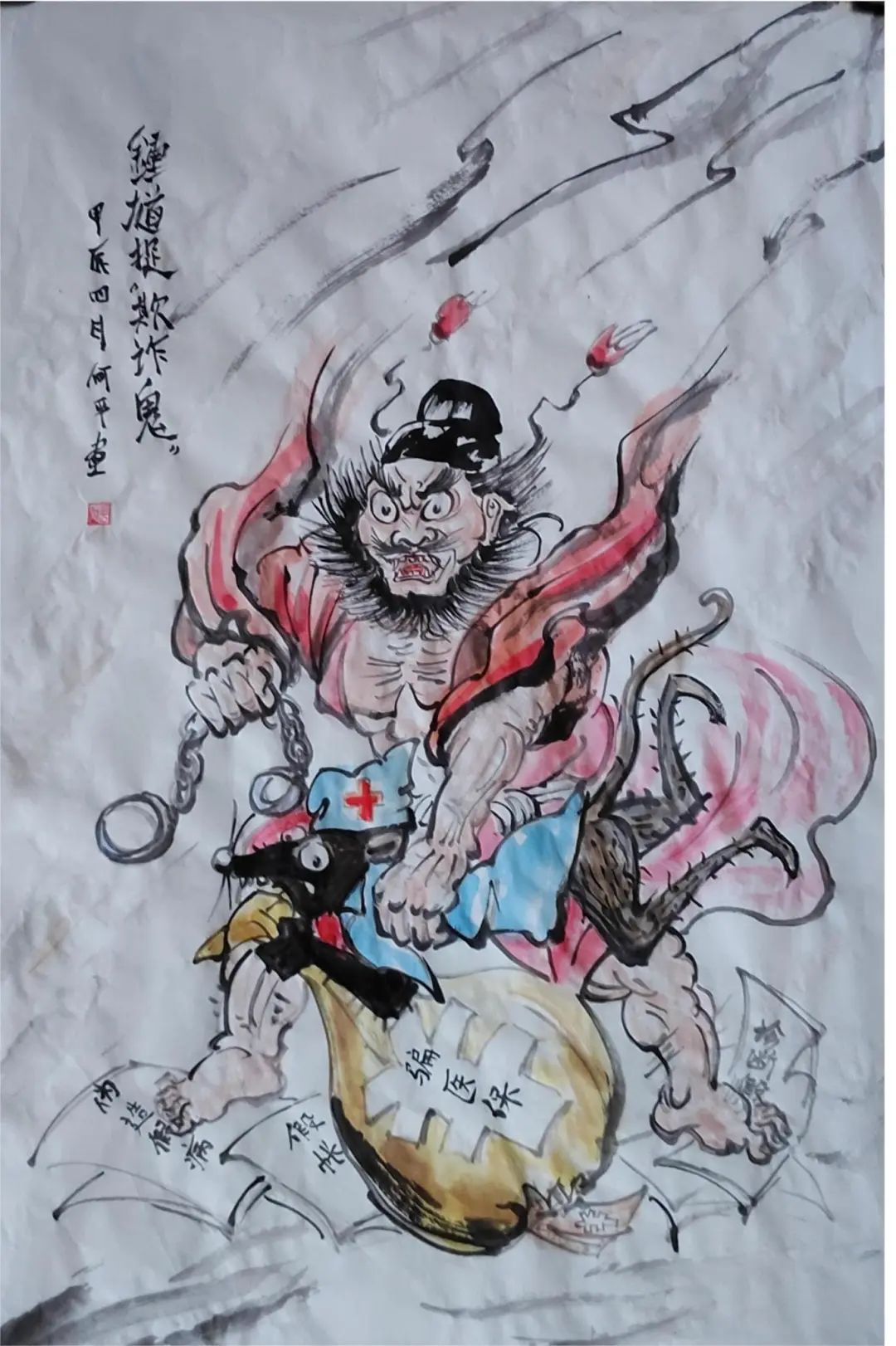 创作理念作者认为神话故事中的钟馗形象通常被视为神勇善战、正义凛然的形象,象征着对邪恶势力的打击和制裁。而医保部门打击欺诈骗保则是维护社会公平正义、保障医保制度的稳定和可持续发展,与神话故事中的钟馗一样维护着公平正义。
