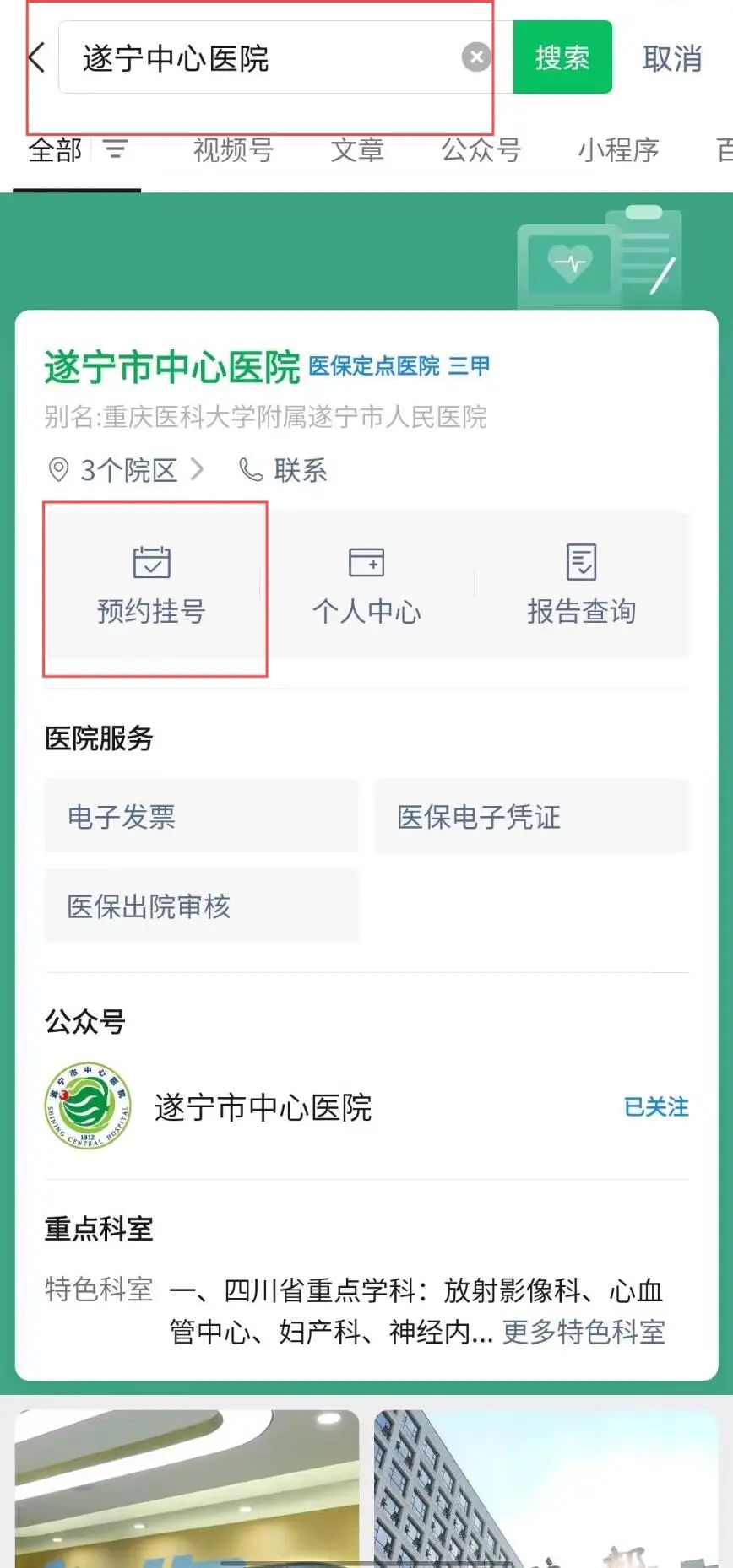 01 打开微信搜索需要就诊的医院并点击“预约挂号”