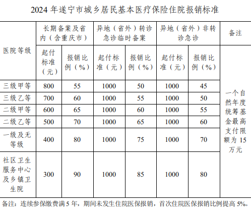参保人员符合政策范围内的住院医疗费用在起付线以上,按一定比例进行报销。医院级别不同,起付线、报销比例也不相同。具体待遇标准如下: