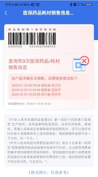 界面如提示“查询到多次医保药品/耗材销售信息”并显示出最近几次的销售记录,该情况说明被查询产品涉嫌多次销售,群众可依据此信息按照《中华人民共和国药品管理法》、《中华人民共和国消费者权益保护法》相关条款要求,向销售此药品的定点医药机构索赔。