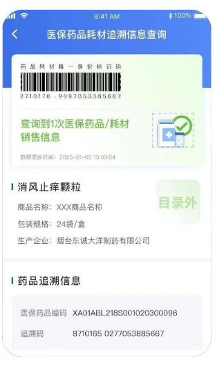 界面如提示“查询到1次药品/耗材销售信息”并显示该追溯码对应的药品通用名、商品名、规格、生产企业、数据更新时间等信息,此情况说明药品来源属于正常合法渠道,患者可以放心使用。