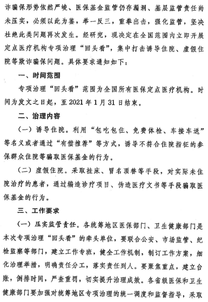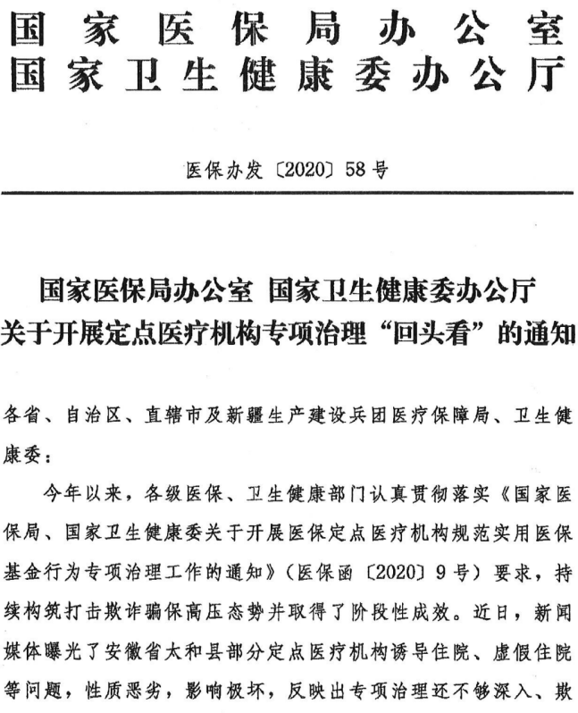 根据《国家医疗保障局办公室 国家卫生健康委办公厅关于开展定点医疗机构专项治理“回头看”的通知》(医保办发〔2020〕58号)和省医保局相关文件要求,现将《全市开展定点医疗机构专项治理“回头看”工作方案》印发给你们,请结合当地实际,认真贯彻落实。