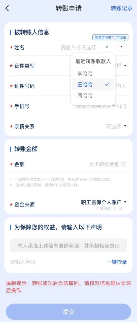 02 单日转账超过3次或转账金额超过2000元后,需医保部门审核才能继续转账;
