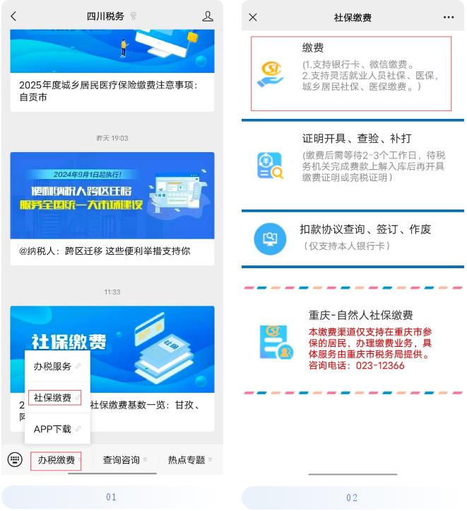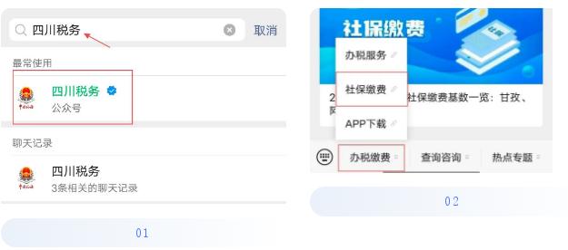 途径1 “四川税务”微信公众号—办税缴费—社保缴费。