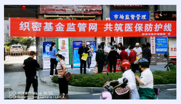 (二)线上线下结合,全域覆盖宣传。射洪市医疗保障局紧扣“织密基金监管网 共筑医保防护线”主题,充分利用微信公众号、QQ工作群等平台,“线上”推送医保法律法规、欺诈骗保典型案例、动画视频等内容;依托办公楼宇、医院挂号大厅、公共交通、户外LED大屏等实体平台,“线下”悬挂宣传标语、展出政策宣传展板、LED滚动播放违法违规动漫短视频等,宣传解读医保基金监管法规政策、经办服务流程和参保报销知识,形成了浓厚的医保基金监管氛围。同时,深入开展医保基金监管宣传“进社区”活动,通过发放宣传资料、解答群众咨询等方式,向社区群众宣传医保待遇和报销政策、欺诈骗保行为、举报奖励政策等内容,引导参保群众共同参与打击欺诈骗保行为,织密基金监管网,共同守护医保基金安全。