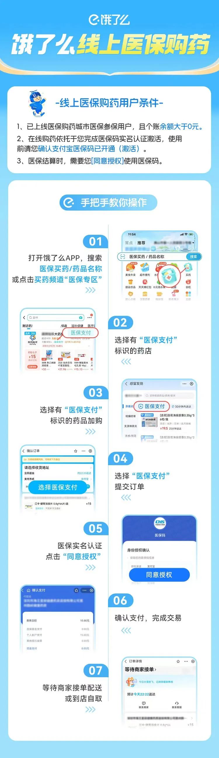 试点地区基本医保参保职工可通过美团、饿了么、京东等互联网购药平台,在具有“医保”标识的药店购买OTC非处方药品时,选择使用“医保移动支付”进行付款,药品费用即可使用医保个人账户进行支付,配送、包装等部分需个人现金支付,实现“手机下单买药、医保个账支付、即时配送到家”。开通线上买药医保支付方式后,可以降低个人外卖买药额外的现金支出。下单完成后,购药平台骑手将送药到家。