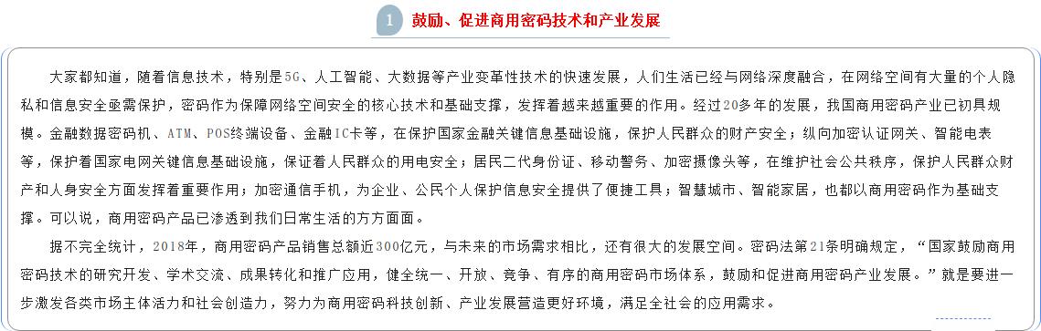 按照党管密码原则和简政放权的要求,密码法在商用密码科技创新、产业发展、人才培养、教育培训、标准化、检测认证、密码应用、进出口、电子认证、行业自律、监督管理等方面作出相应规定。