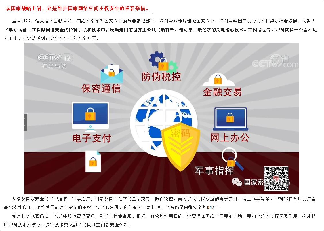 刚才为您讲述了核心密码和普通密码,而密码除了用于保护国家秘密,也与我们老百姓的生活息息相关。那么,密码在我们的日常生活中都有哪些应用?密码法又是怎么规定的呢?我们将在明天的节目中继续为您讲述。